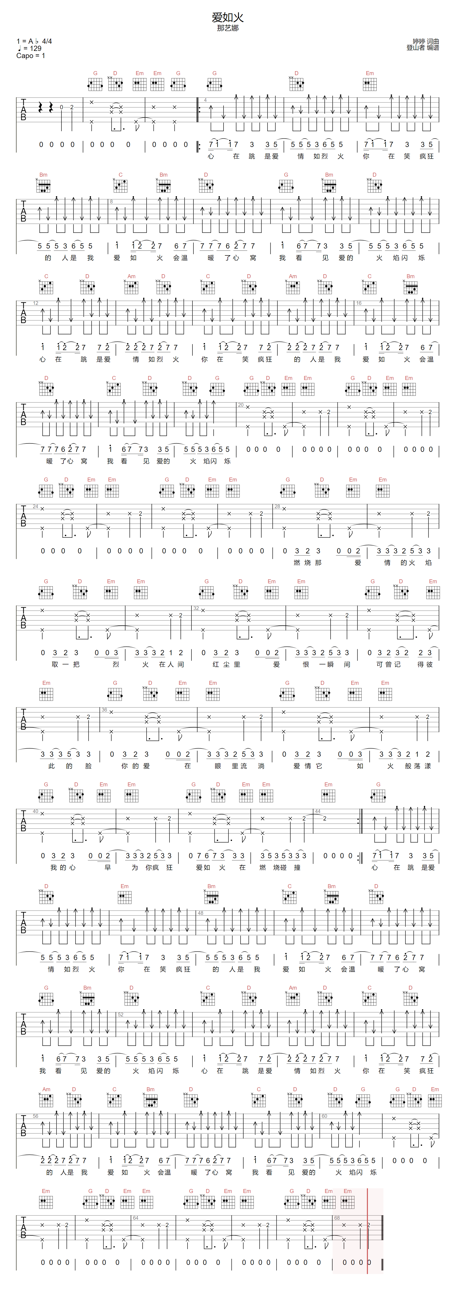 爱如火 G调指法原版编配