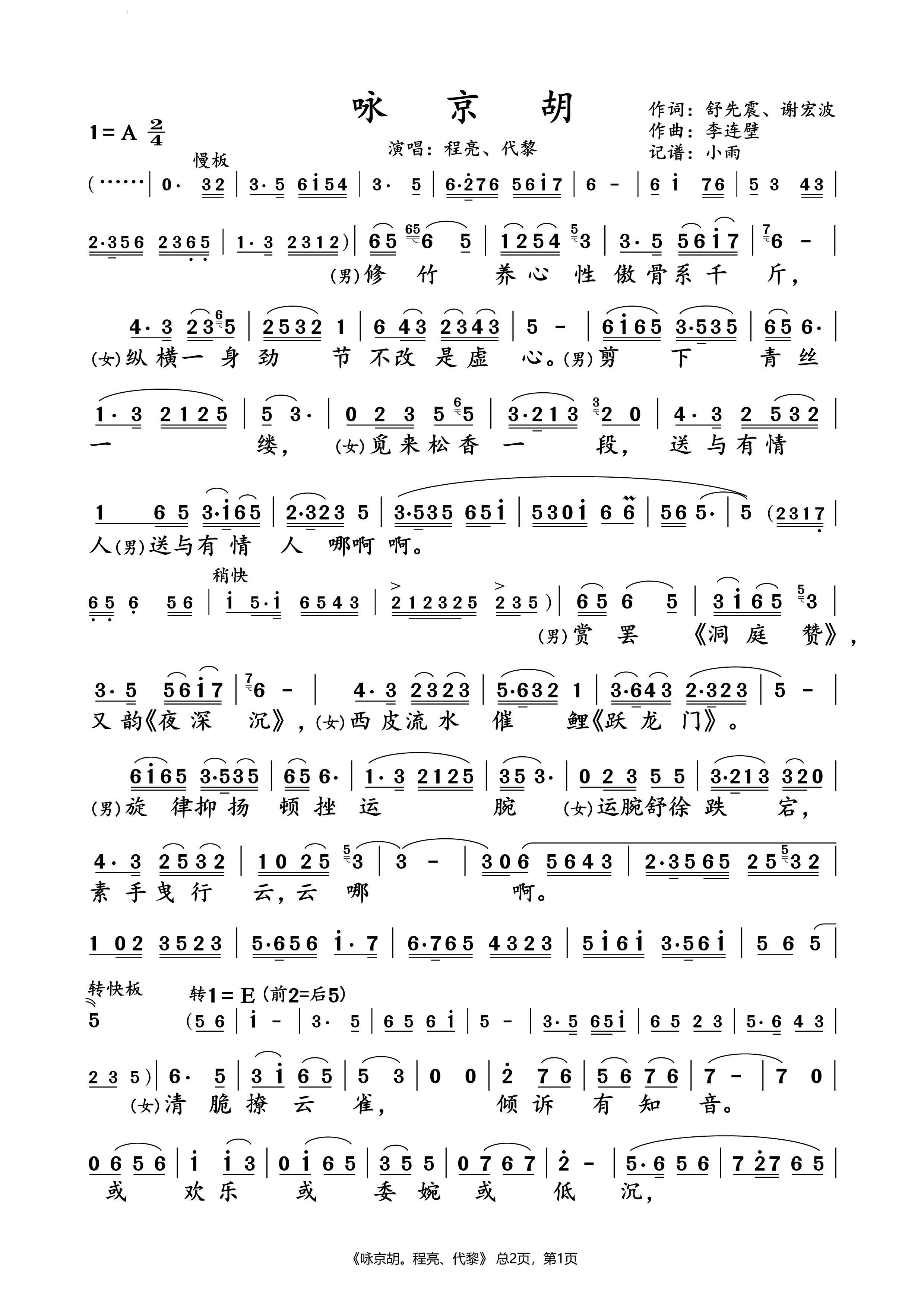 > 咏京胡程亮 代黎 对唱谱