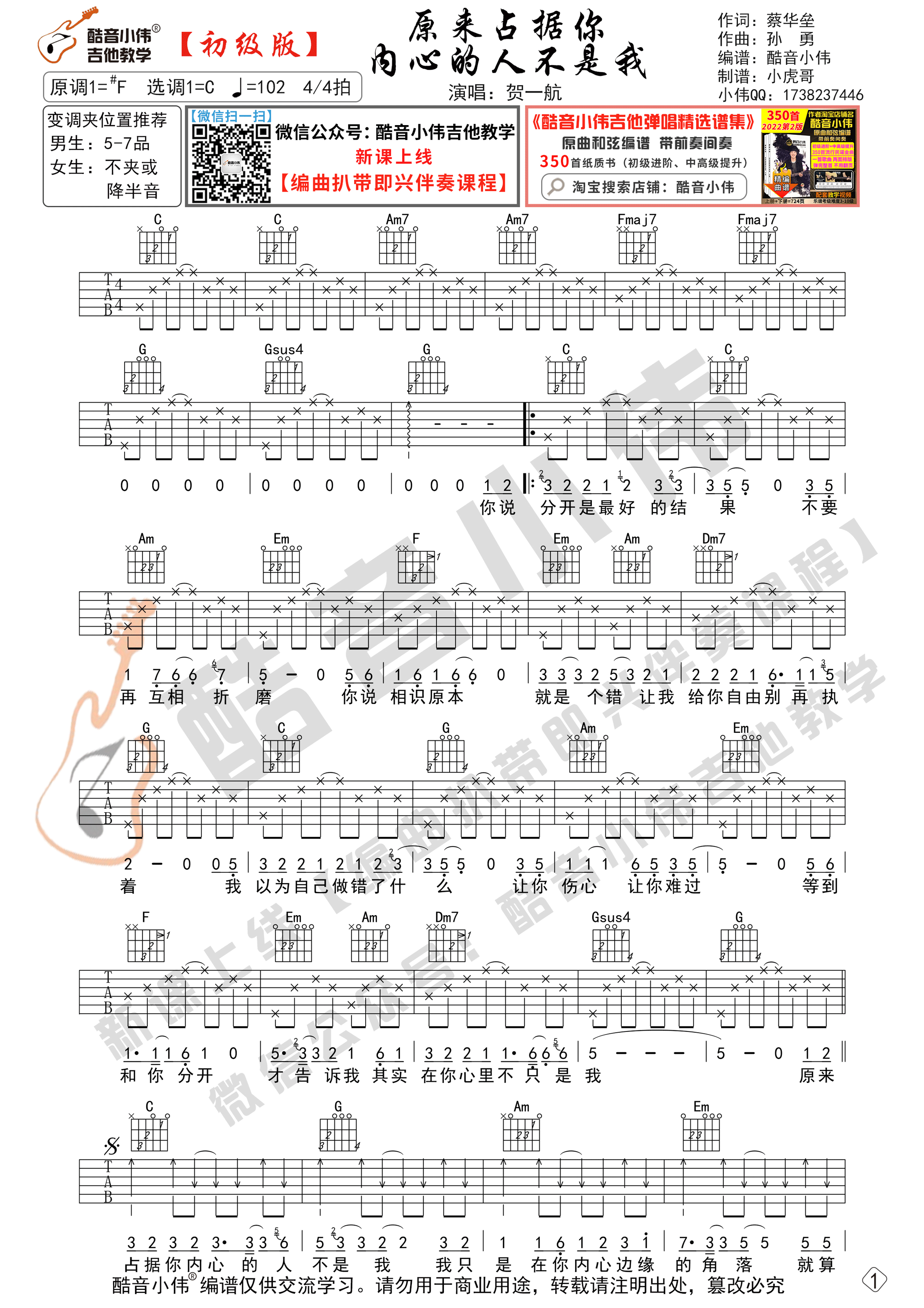 原来占据你内心的人不是我 C调初级版 酷音小伟吉他教学