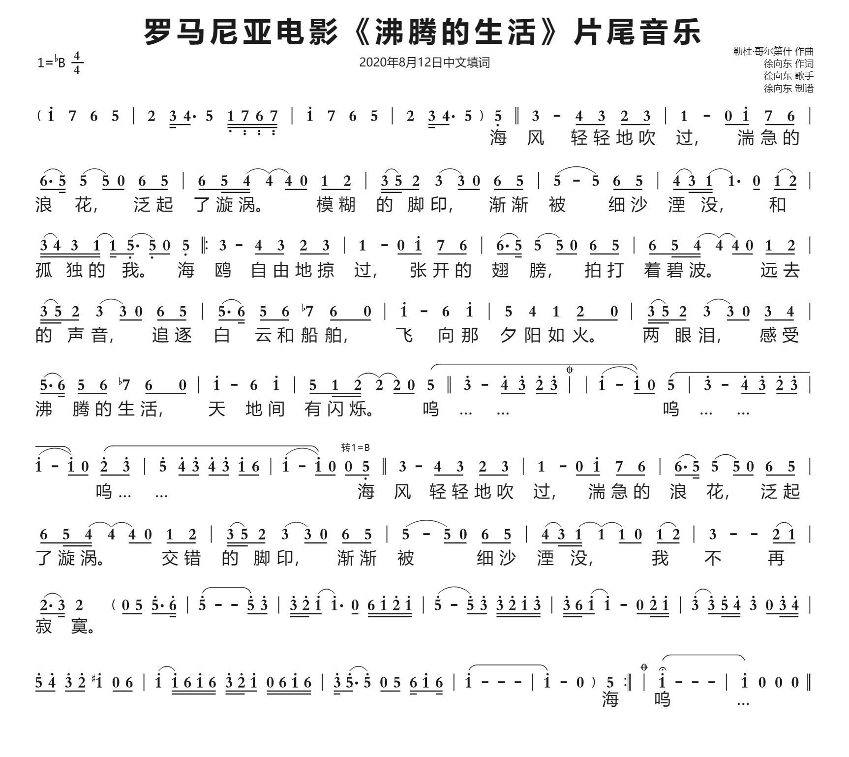 罗马尼亚电影 沸腾的生活 片尾音乐 徐向东中文填词 2020年8月12日填词