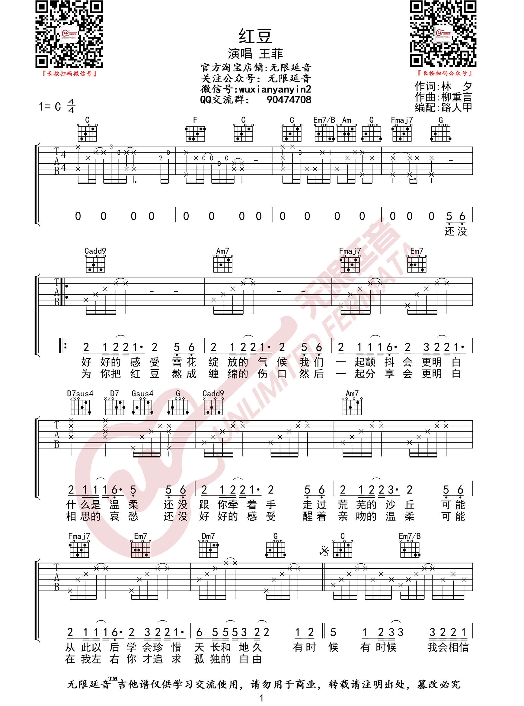 > 红豆 C调指法原版编配