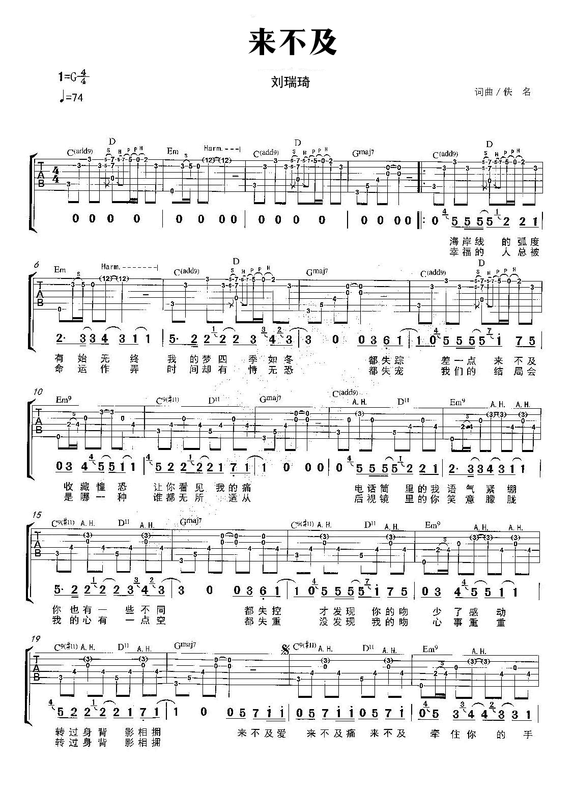 > 来不及 G调指法原版编配