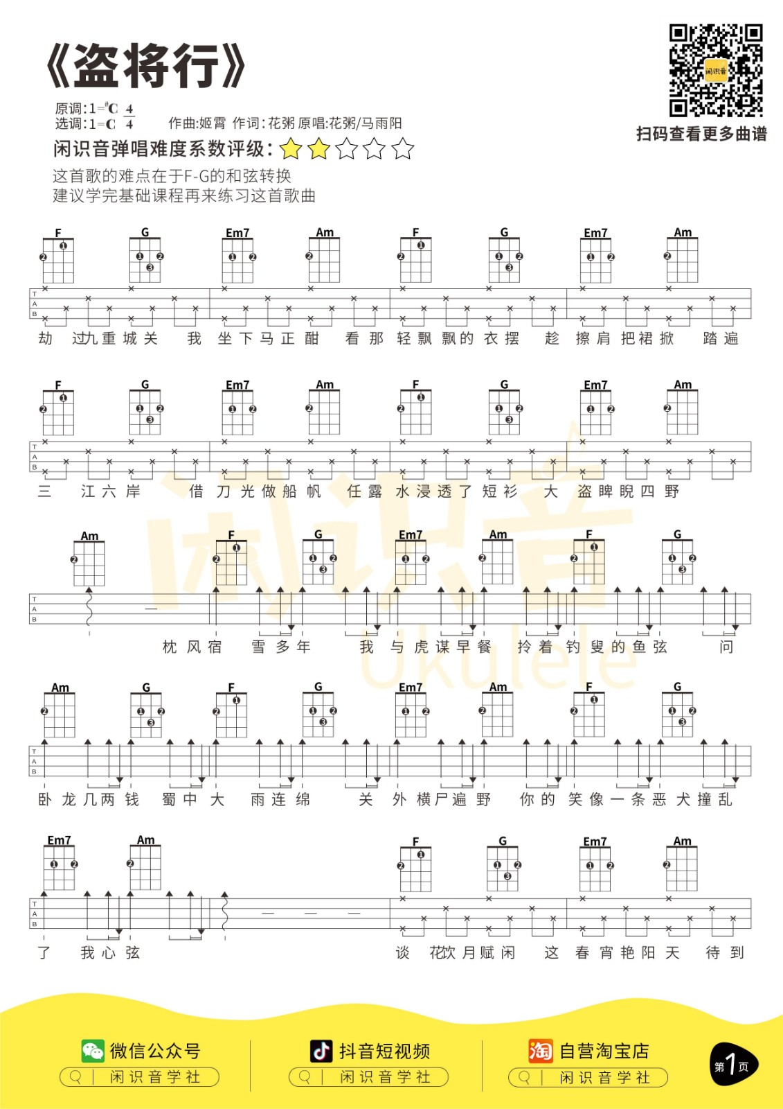 > 盗将行尤克里里谱 C调四