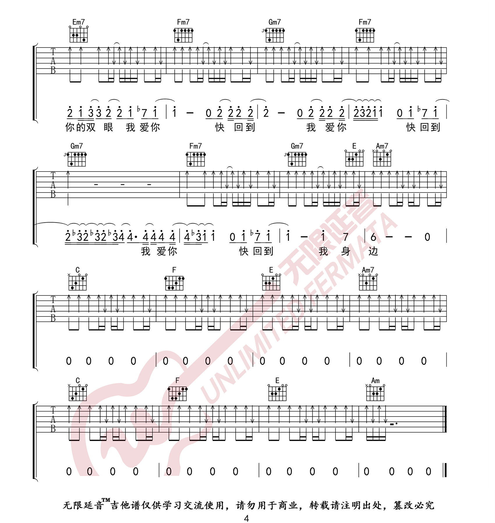 > 我爱你 C调原版编配