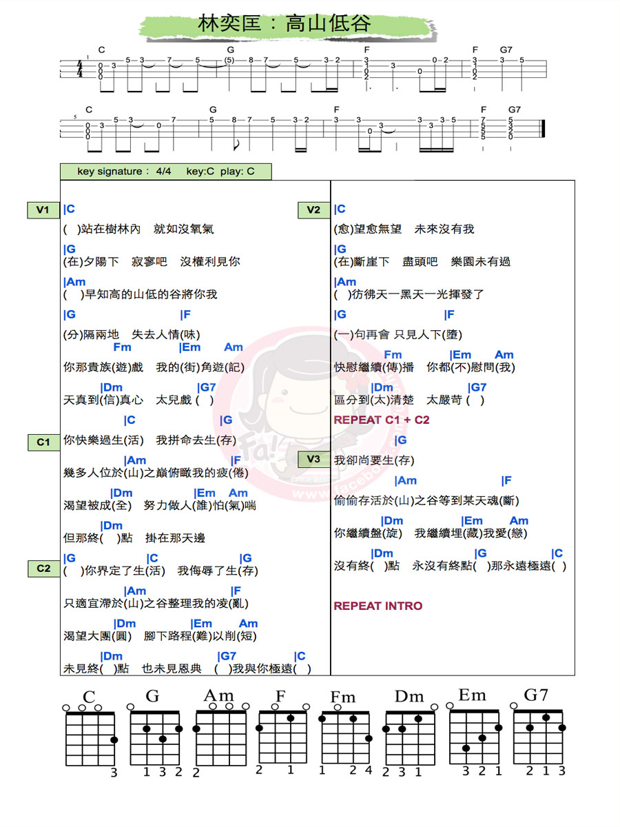 高山低谷尤克里里谱 C调尤克里里弹唱谱