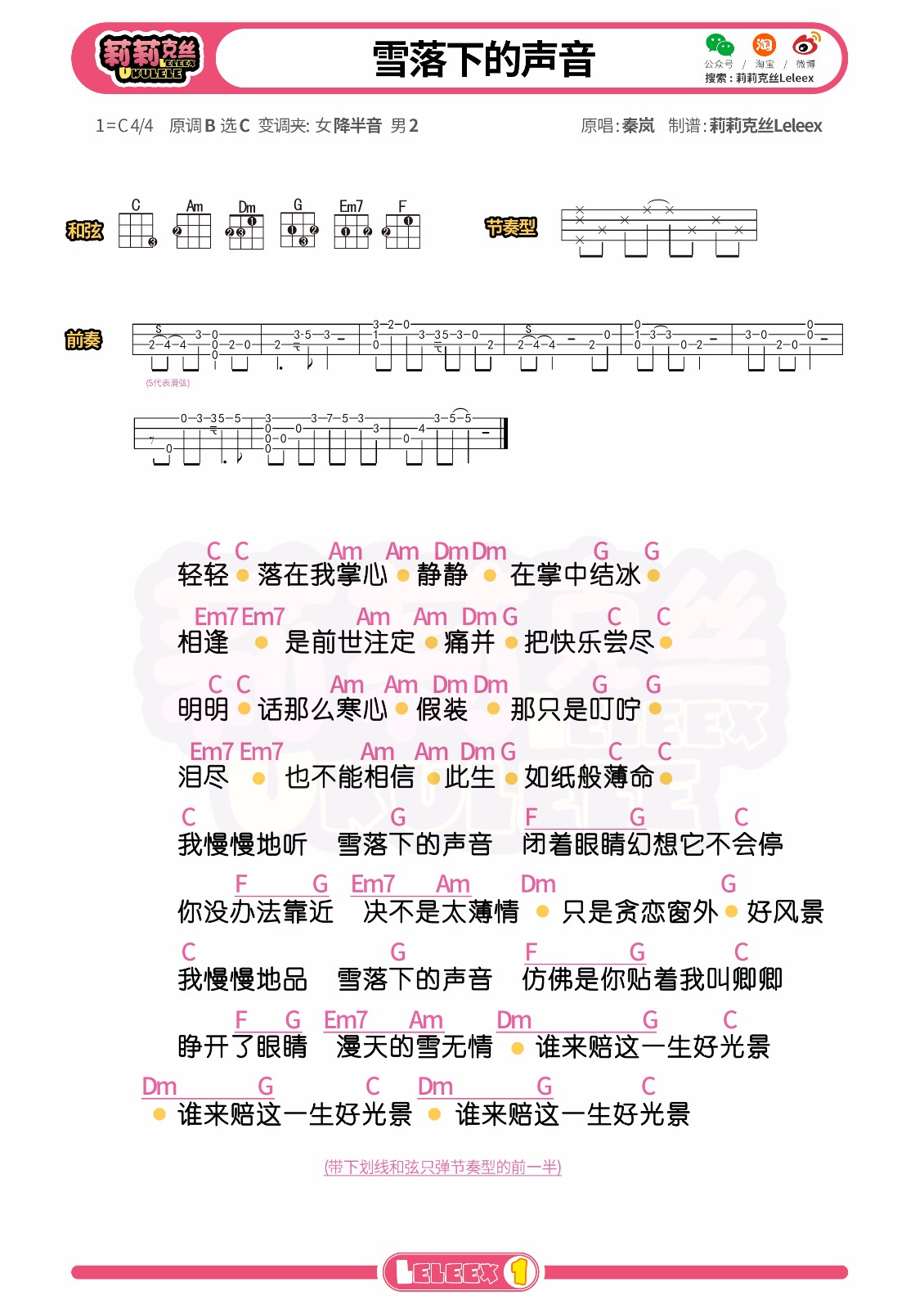 > 雪落下的声音尤克里里谱 C调尤克里里弹唱谱