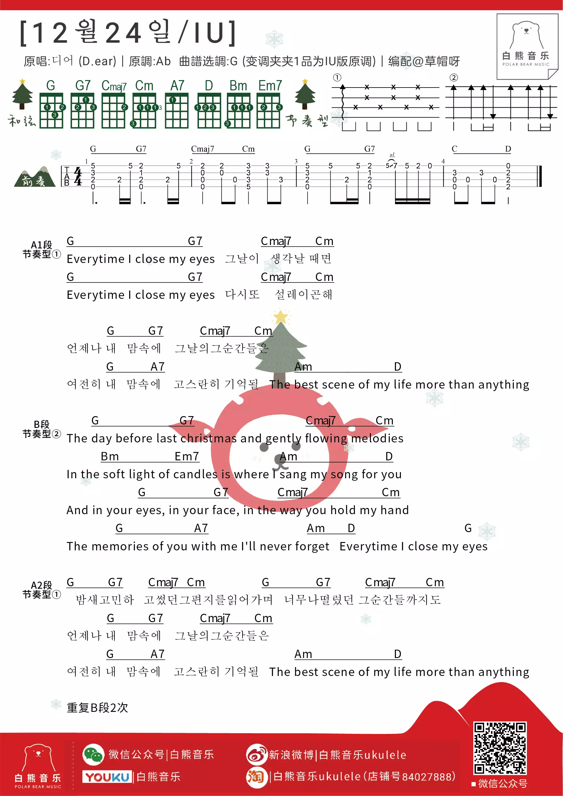 12月24日尤克里里谱 G调乌克丽丽ukulele弹唱谱