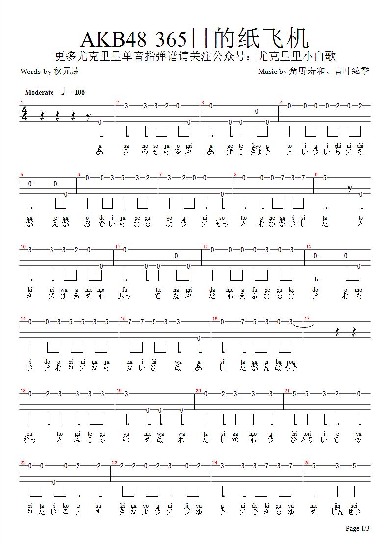 365天的纸飞机尤克里里谱 ukulele指弹谱