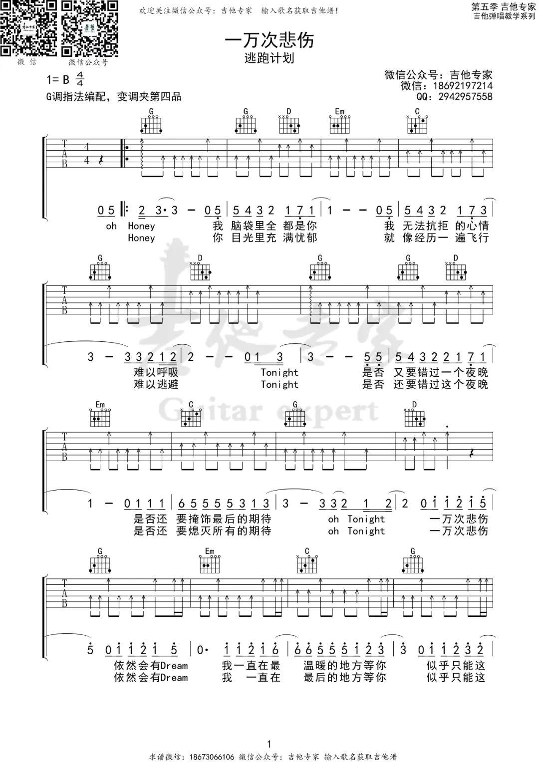 一万次悲伤 G调原版编配