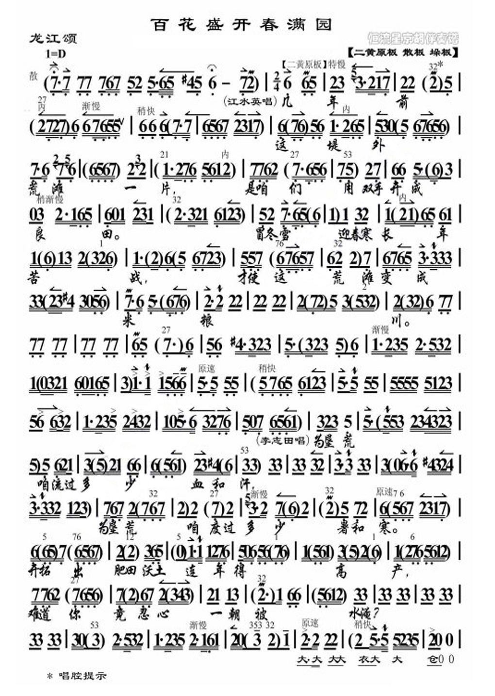 > 百花盛开春满园 龙江颂 江水英 李志田唱段 京胡伴奏谱