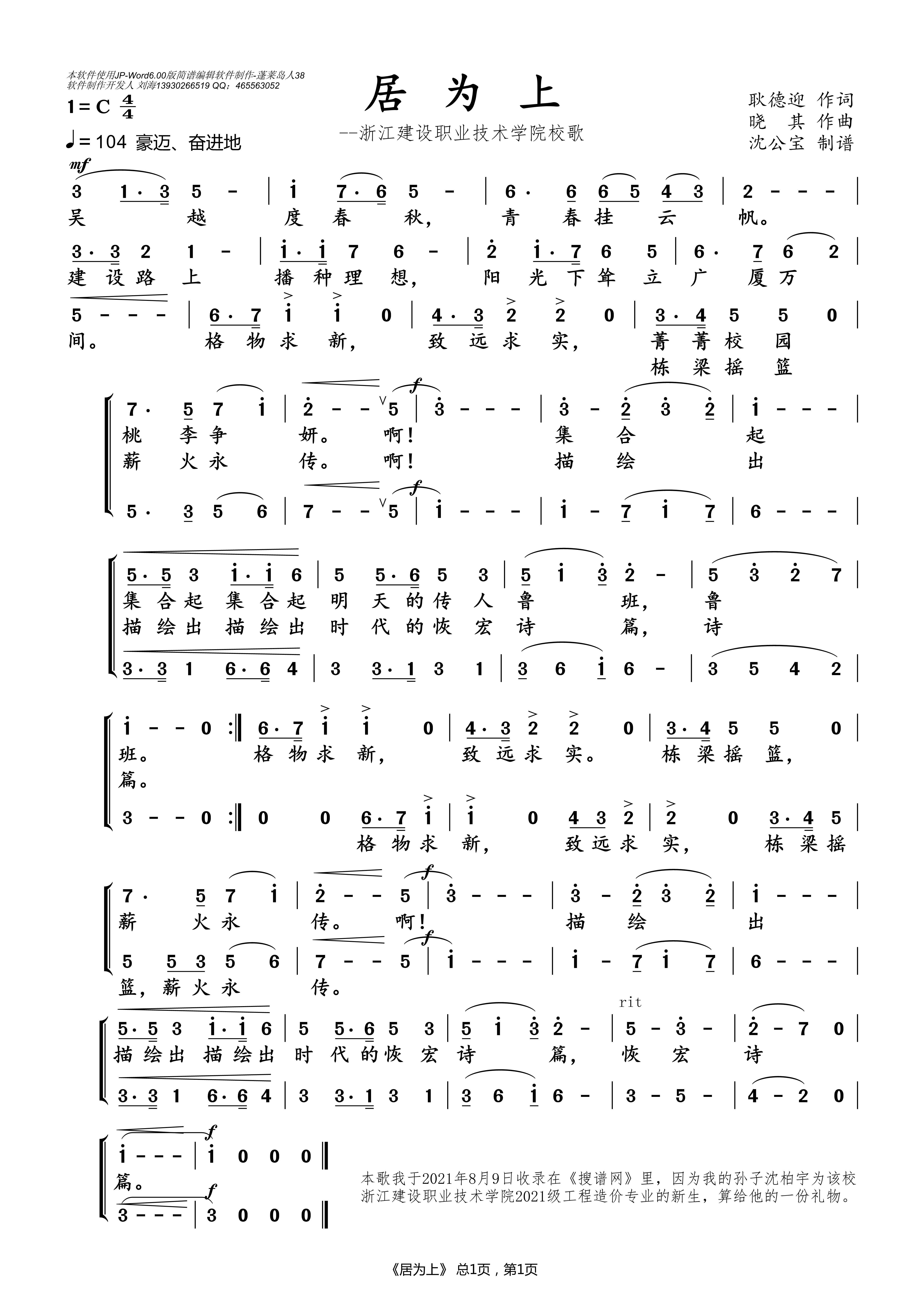 居为上 浙江建设职业技术学院校歌