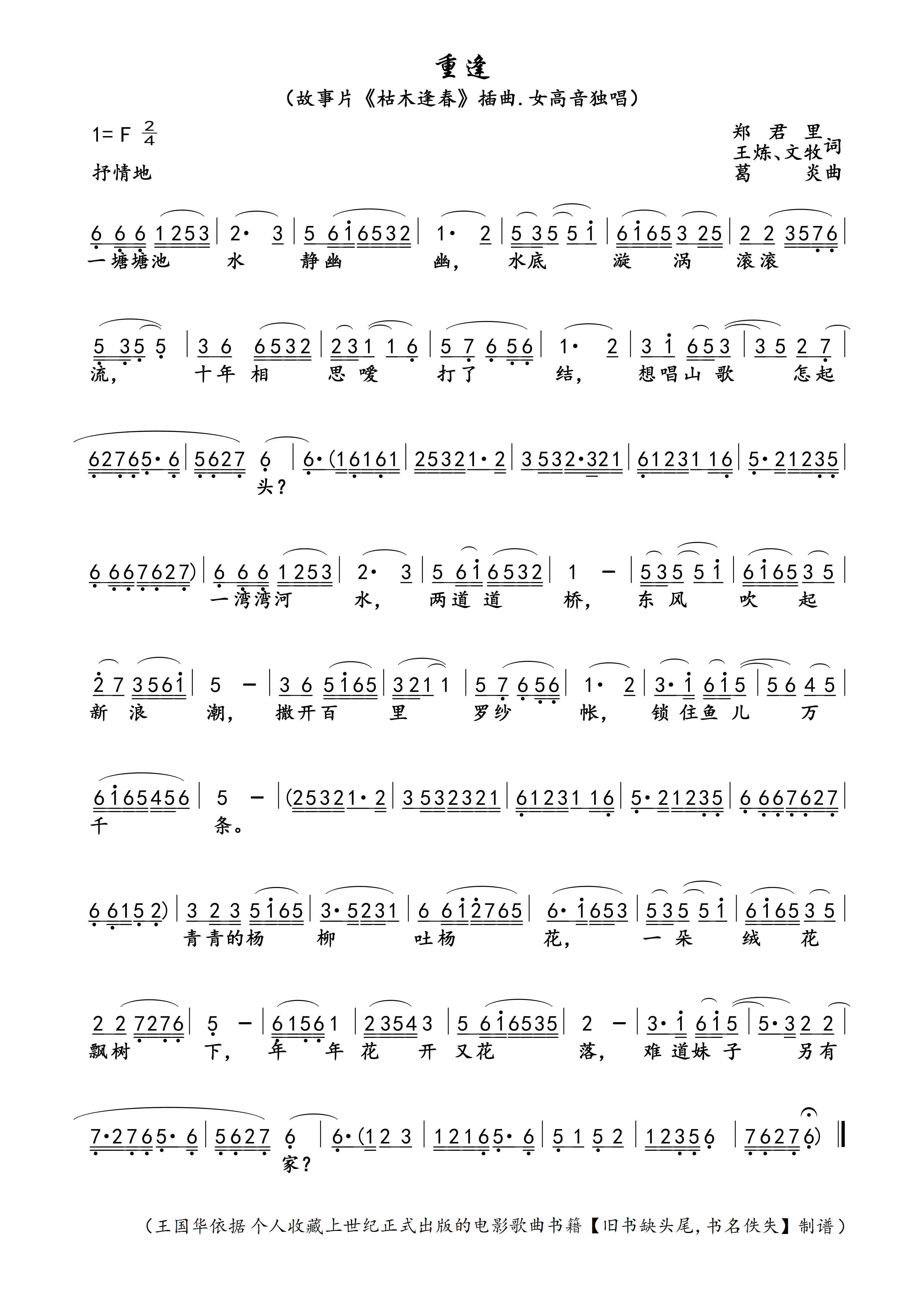 重逢 故事片 枯木逢春 插曲 制谱