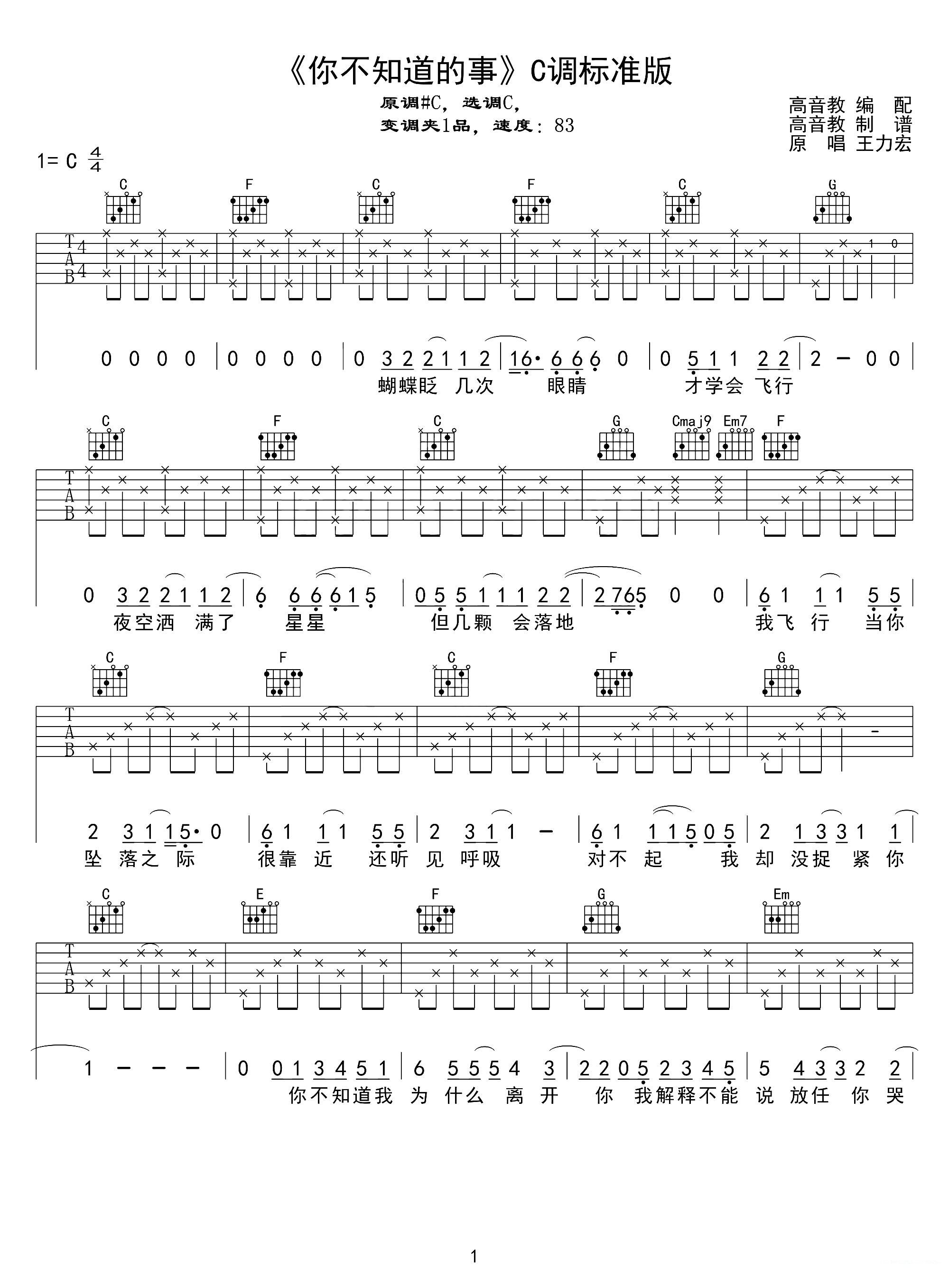 > 你不知道的事 C调标准版 王力宏 高音教编配