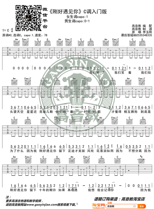 > 刚好遇见你 C调入门版 高音教编配 猴哥吉他教学