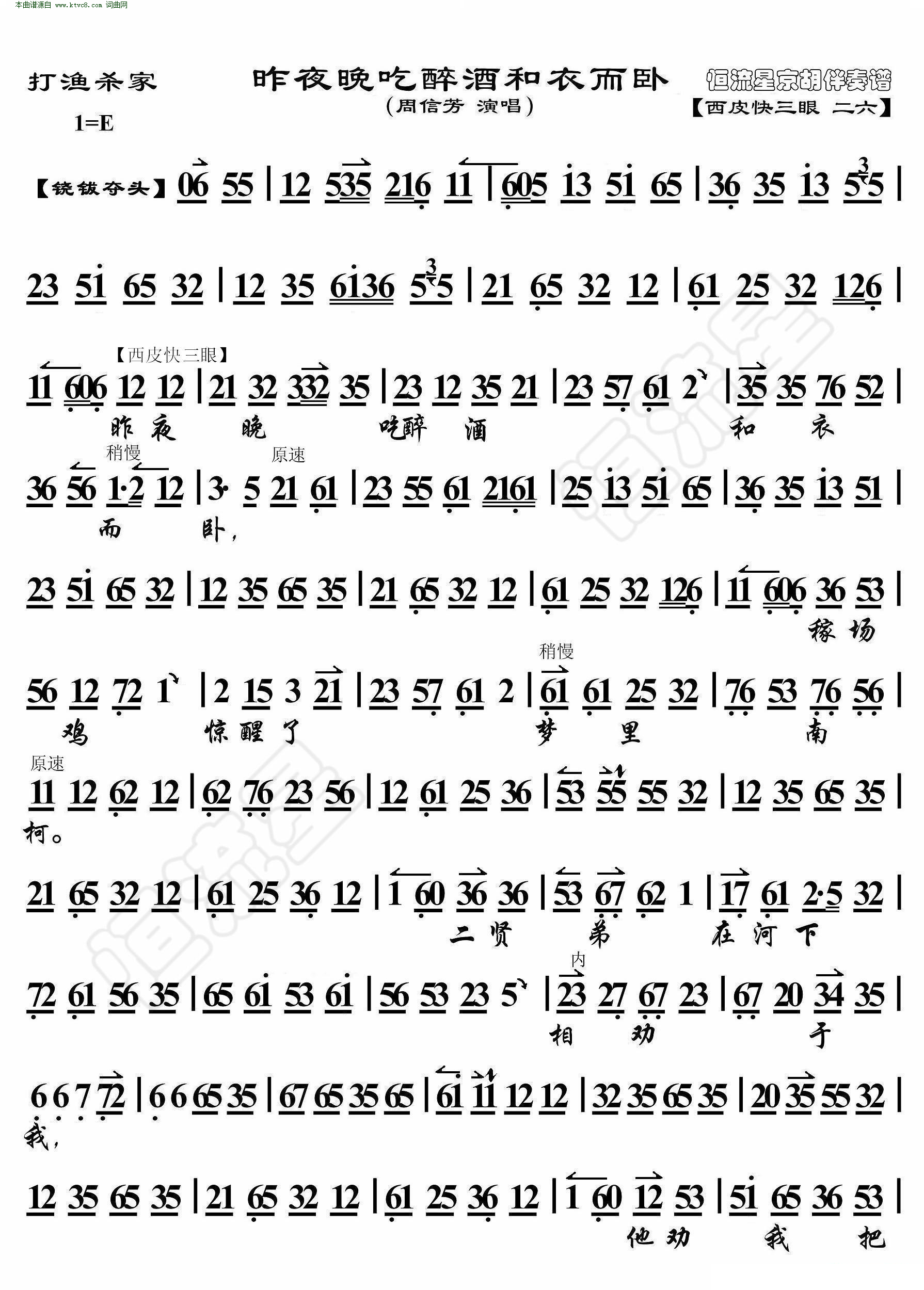 打渔杀家 昨夜晚吃醉酒和衣而卧 京胡伴奏谱
