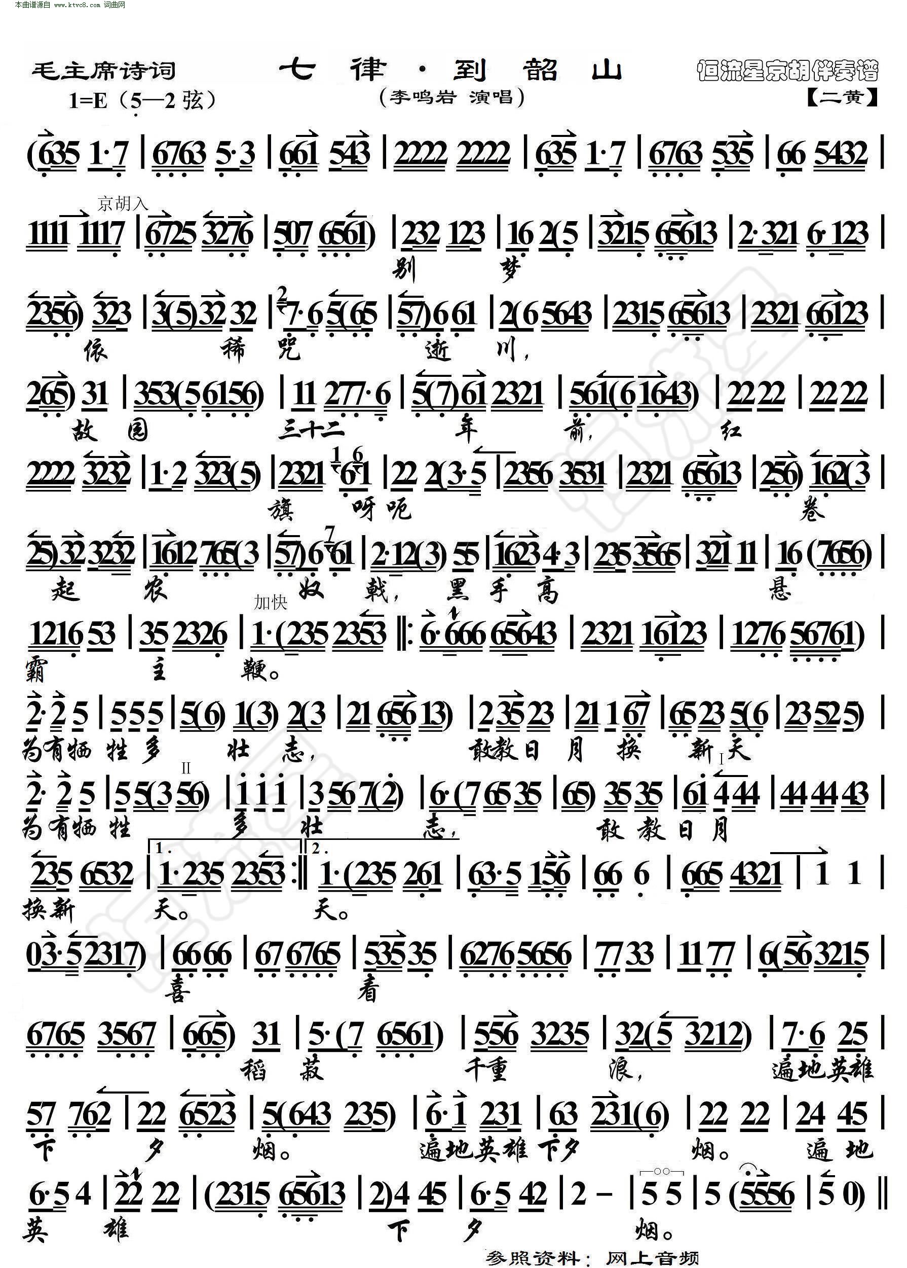 七律 到韶山 毛主席诗词 京胡伴奏谱