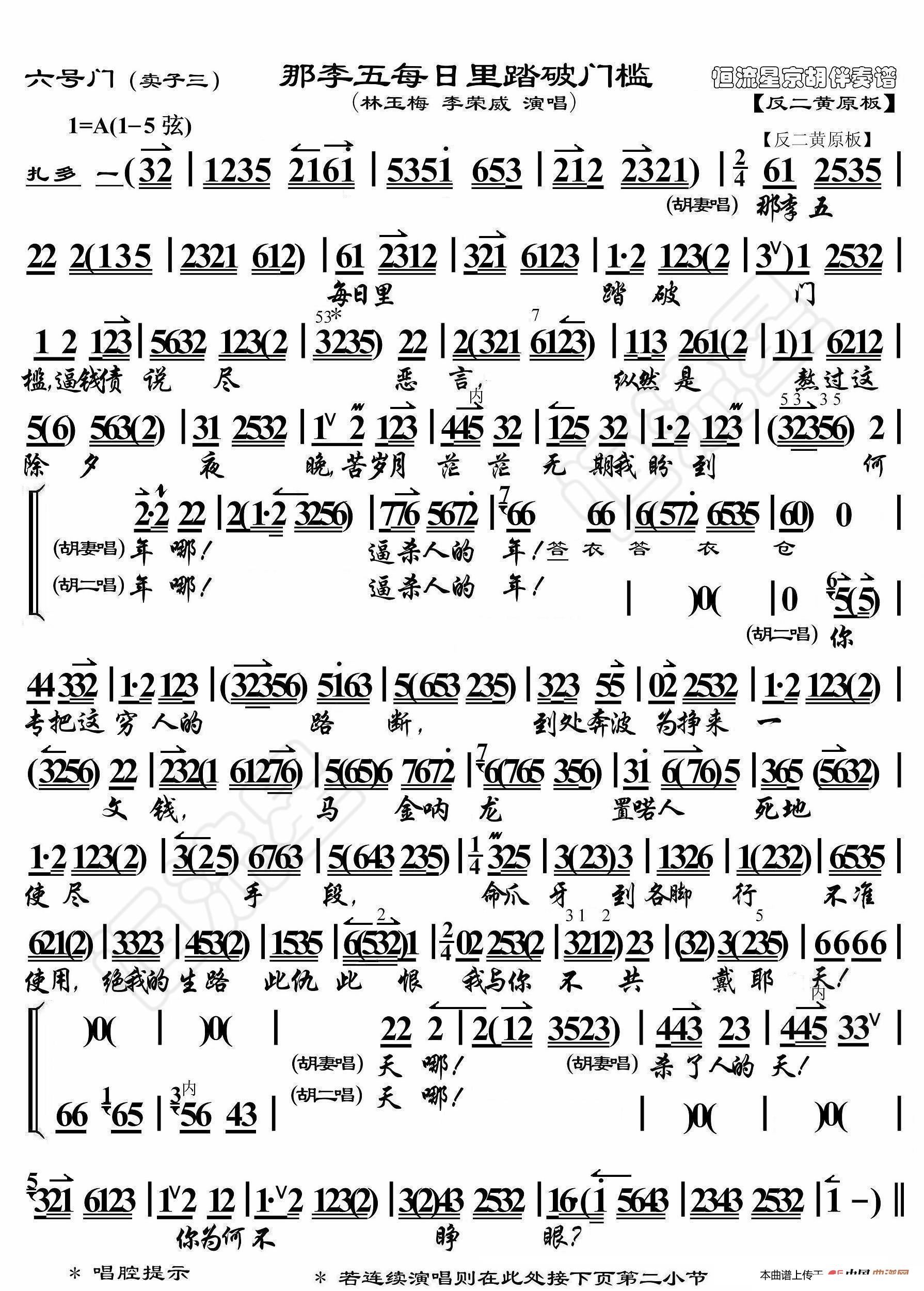 > 六号门 那李五每日里踏破门槛 京胡伴奏谱