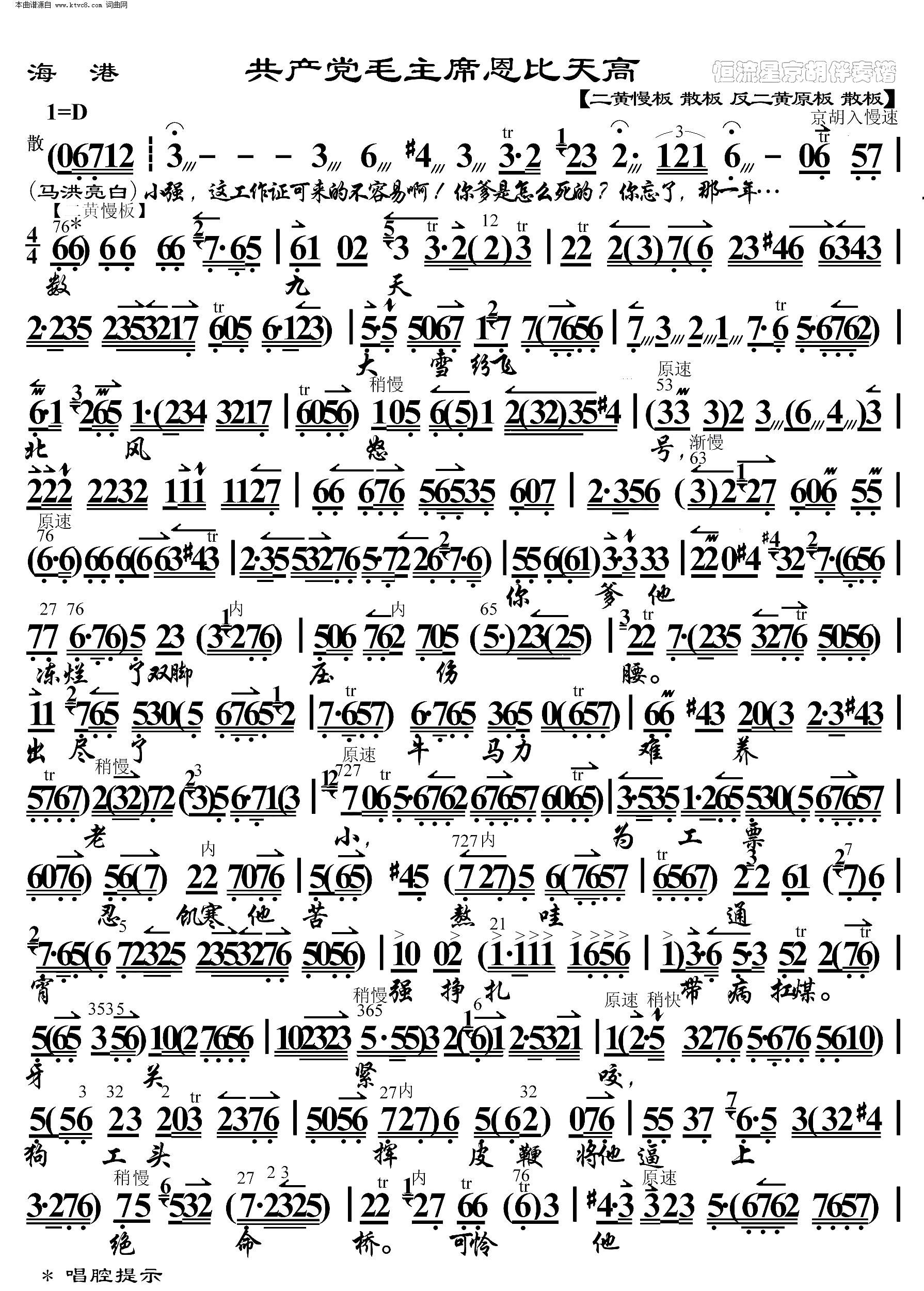 > 海港 共产党毛主席恩比天高 京胡伴奏谱