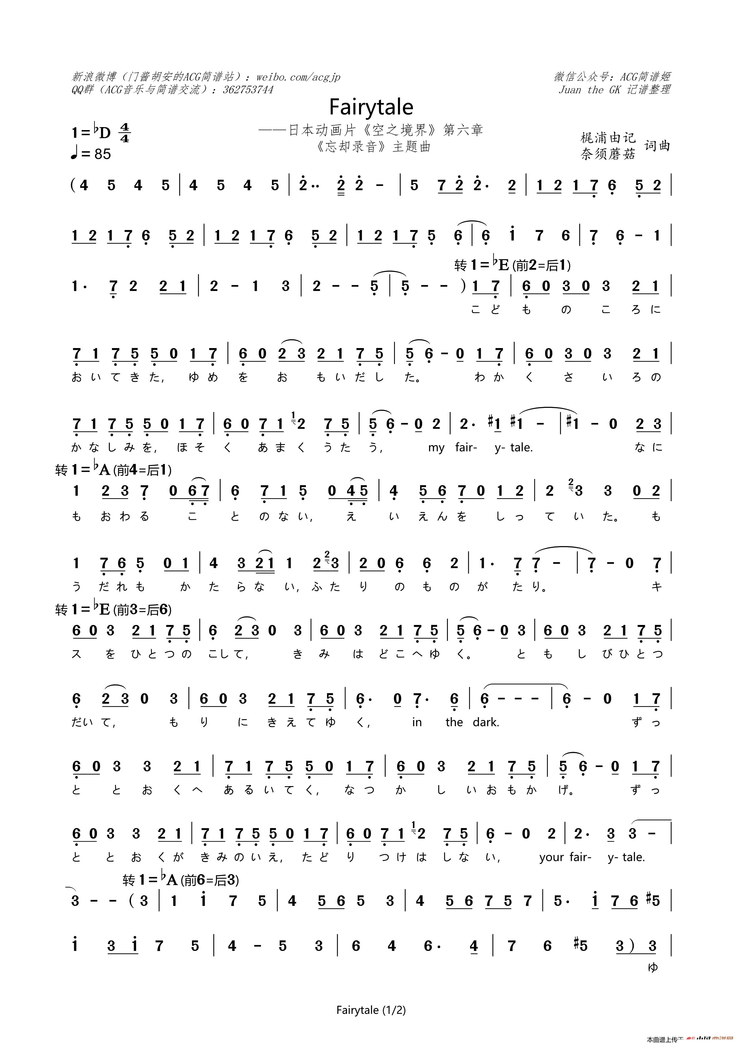 > 日 Fairytale 剧场版 空之境界 第六章 忘却录音 主题曲