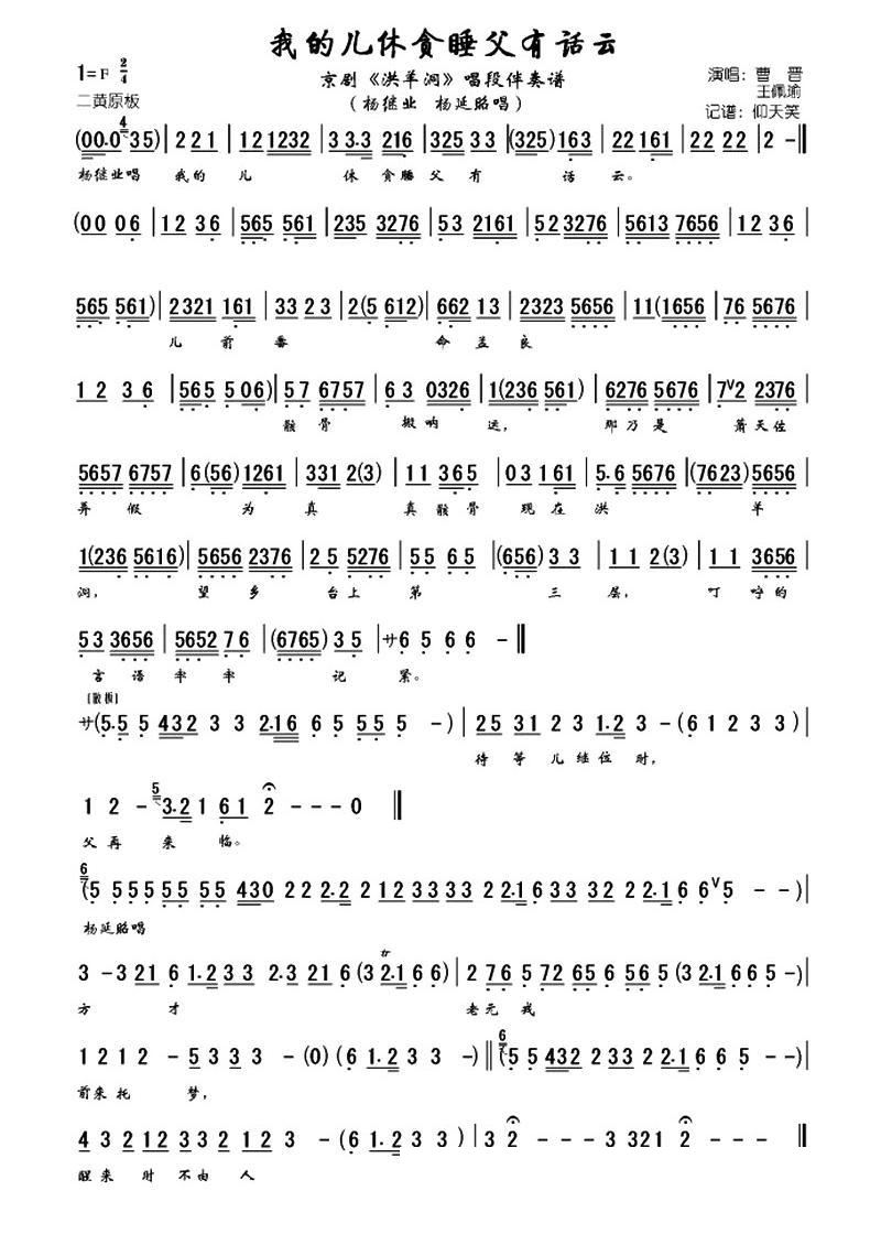 洪羊洞 全本唱段伴奏谱 我的儿休贪睡父有话云 杨继业 杨延昭唱段