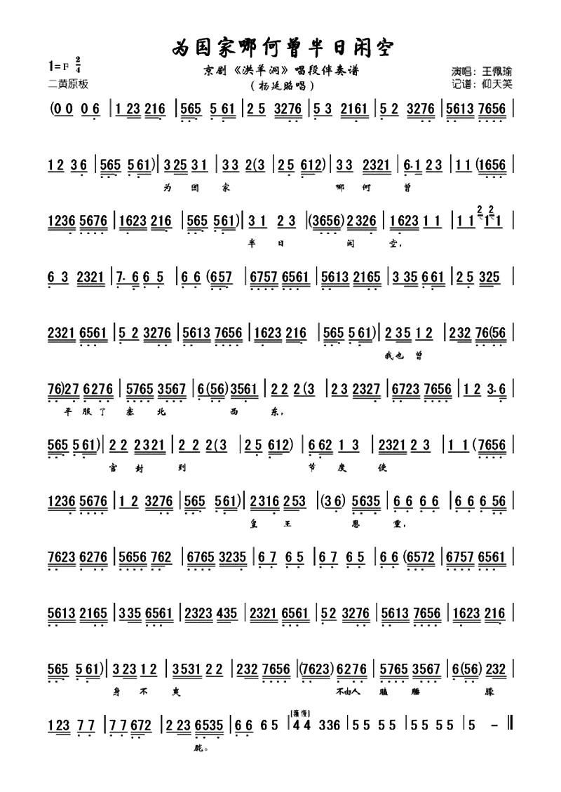 洪羊洞 全本唱段伴奏谱 为国家那何曾半日闲空 杨延昭唱段