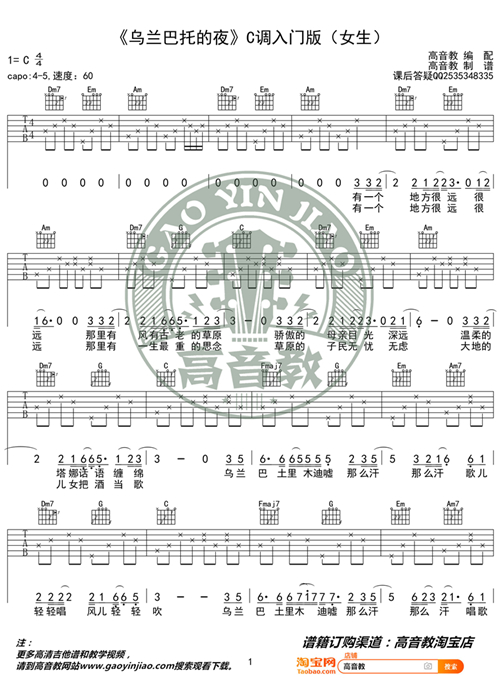 乌兰巴托的夜 C调入门女生版 高音教编配 猴哥吉他教学