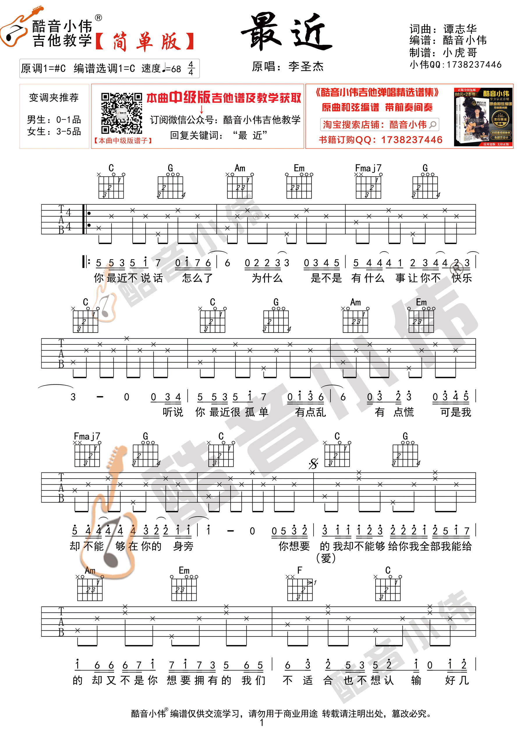> 最近 简单版 酷音小伟吉他弹唱教学