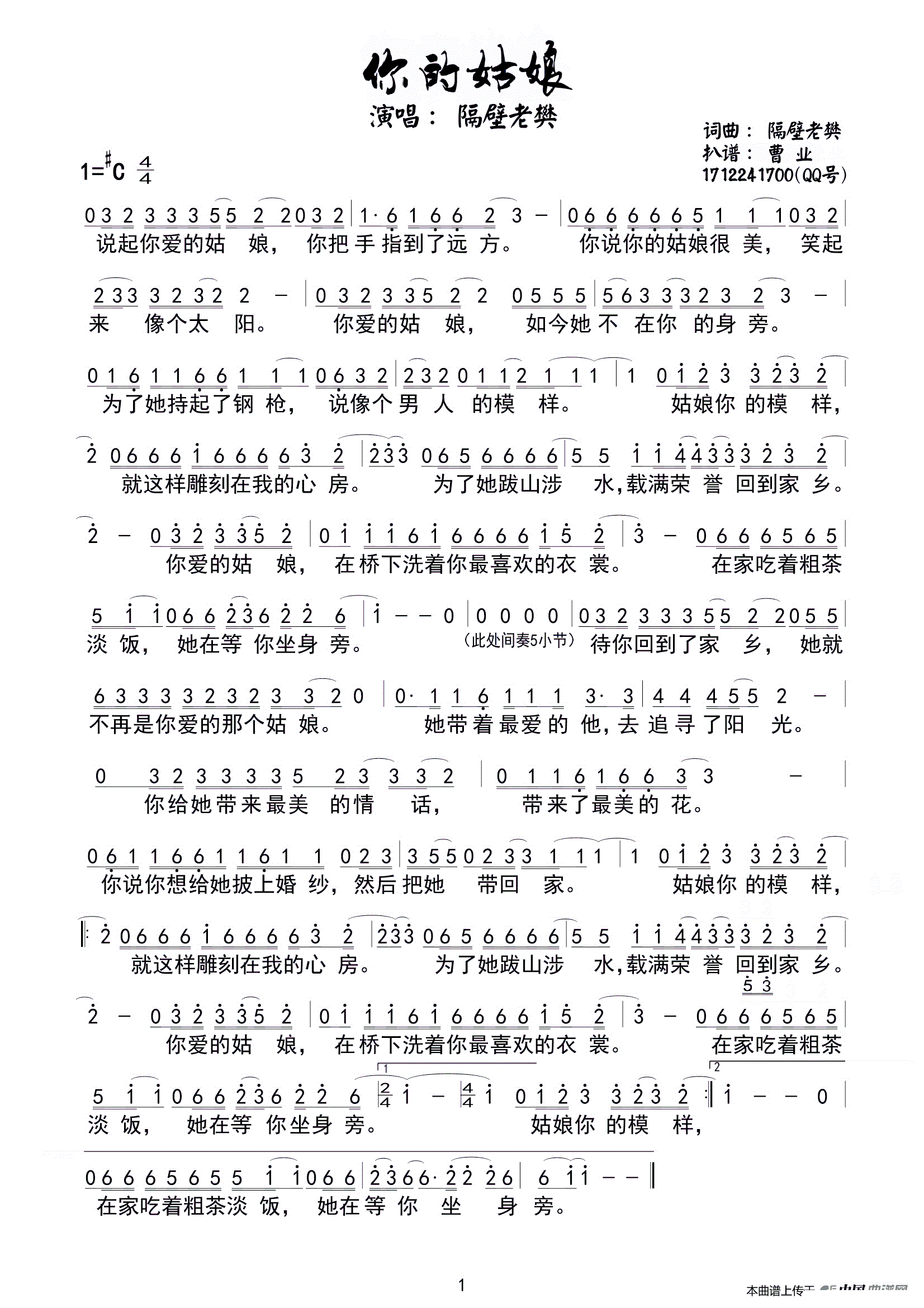 你的姑娘 曹业扒谱版