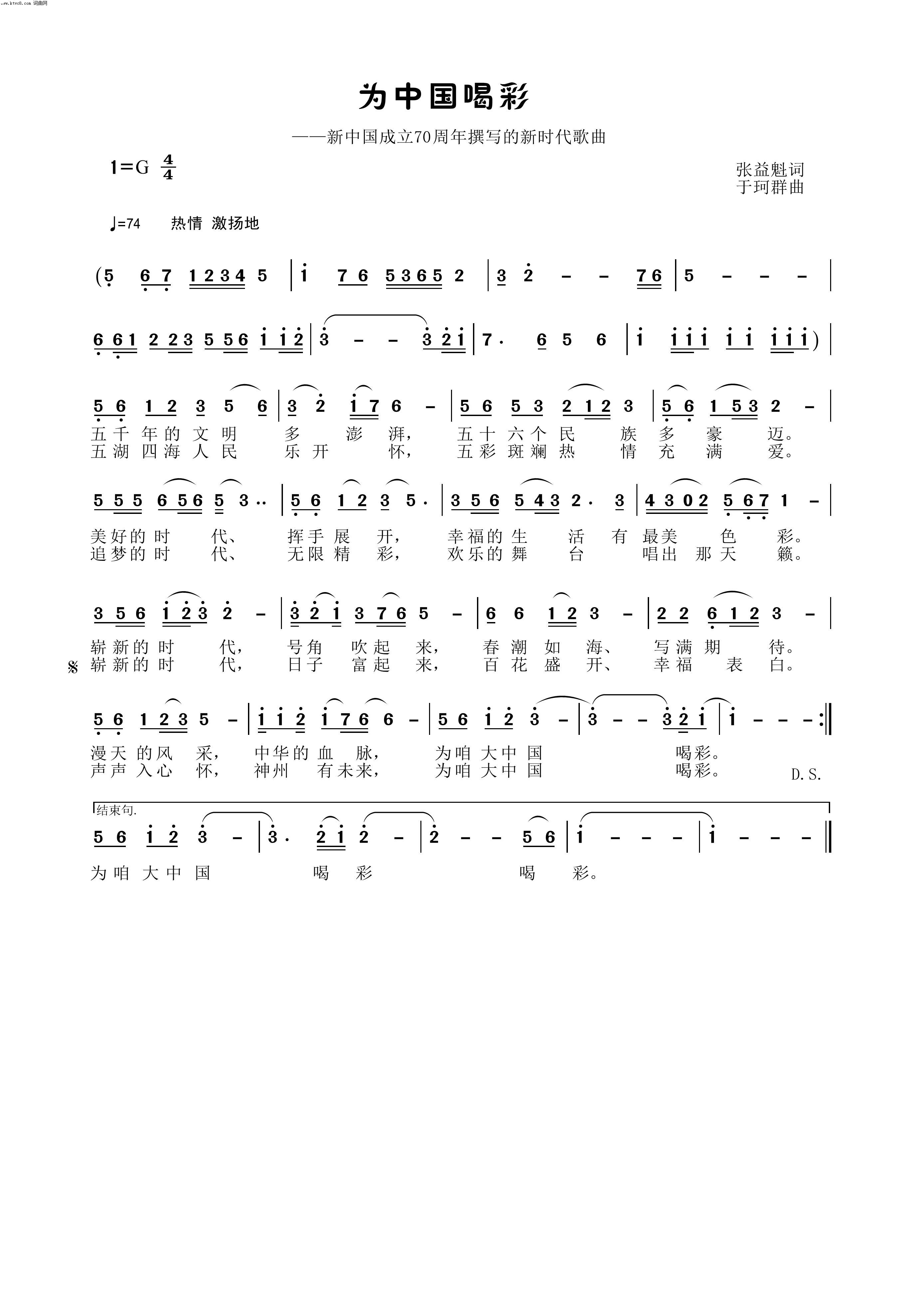 为中国喝彩 新中国成立70周年撰写的新时代歌曲