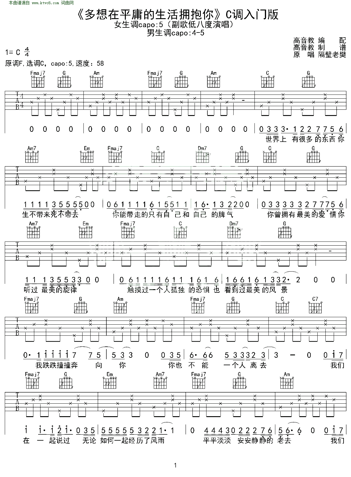 > 多想在平庸的生活拥抱你 C调入门版 有谱 高音教