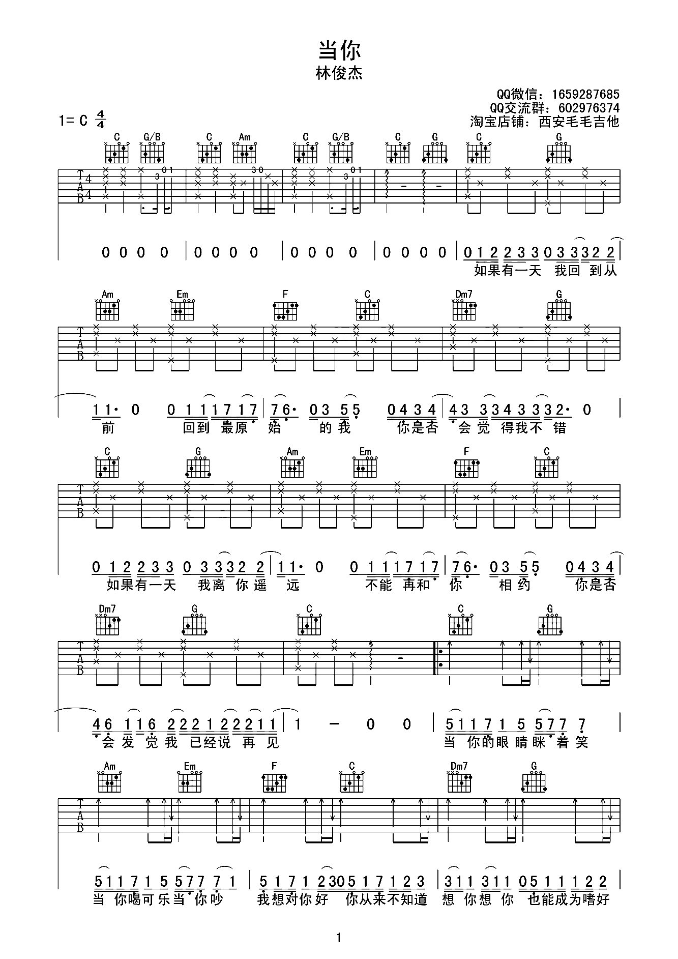 > 当你 西安毛毛吉他编配版