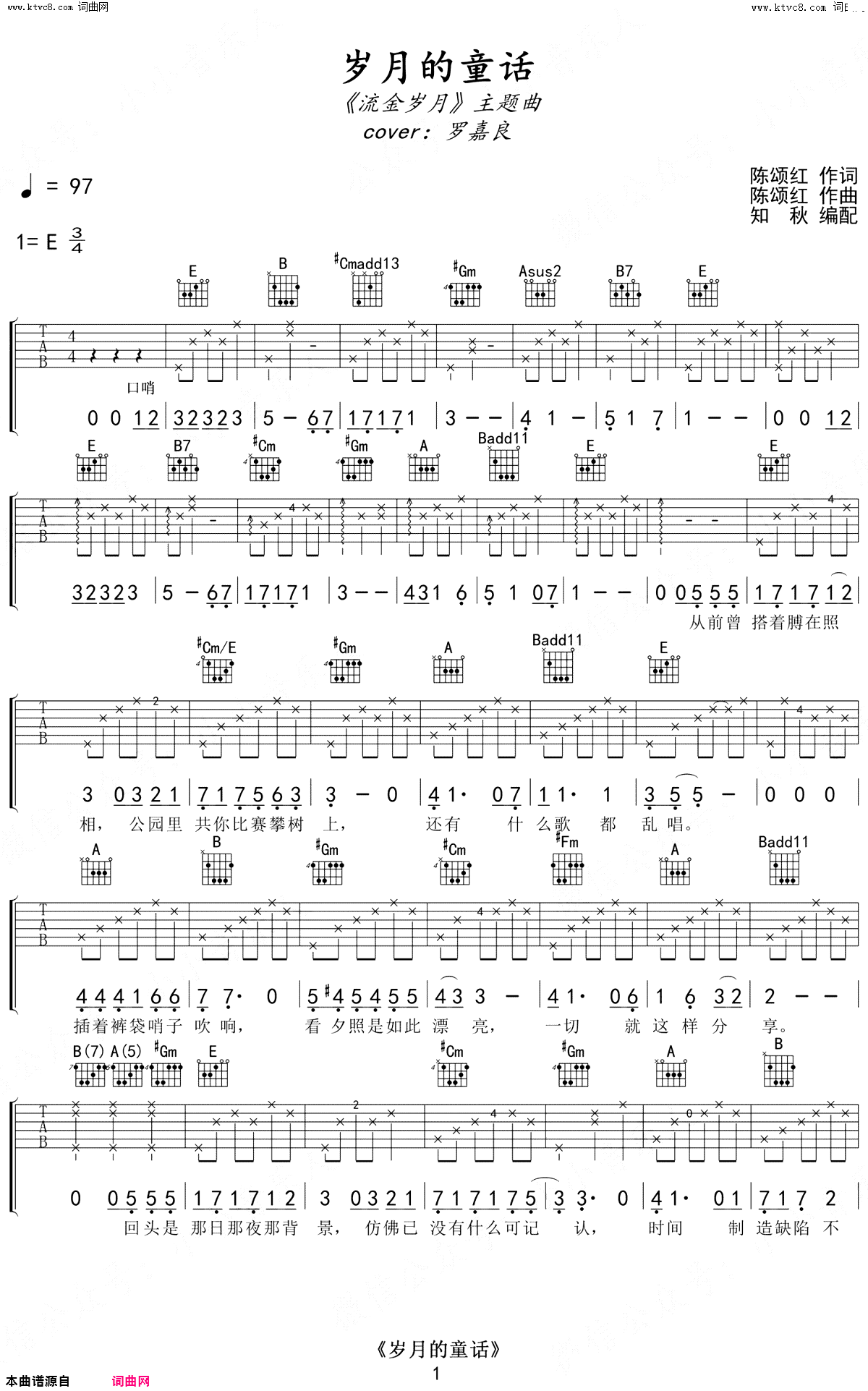 岁月的童话 流金岁月主题曲 弹唱谱
