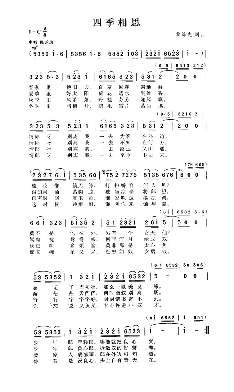 - [歌谱,黄梅戏谱] 四季相思 啼笑因缘