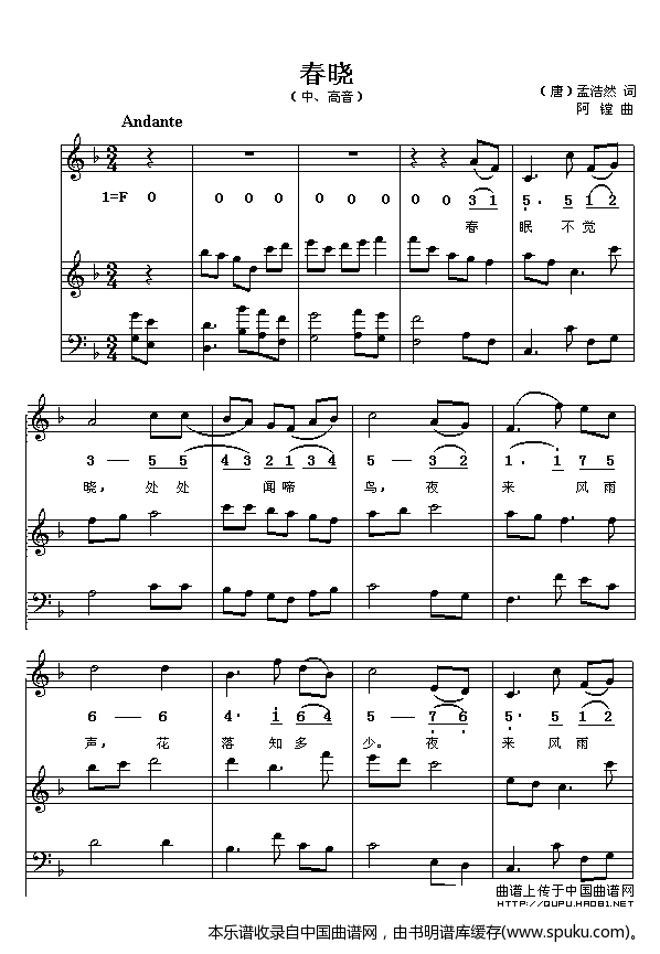 - [歌谱] 春晓 孟浩然诗 颂今曲