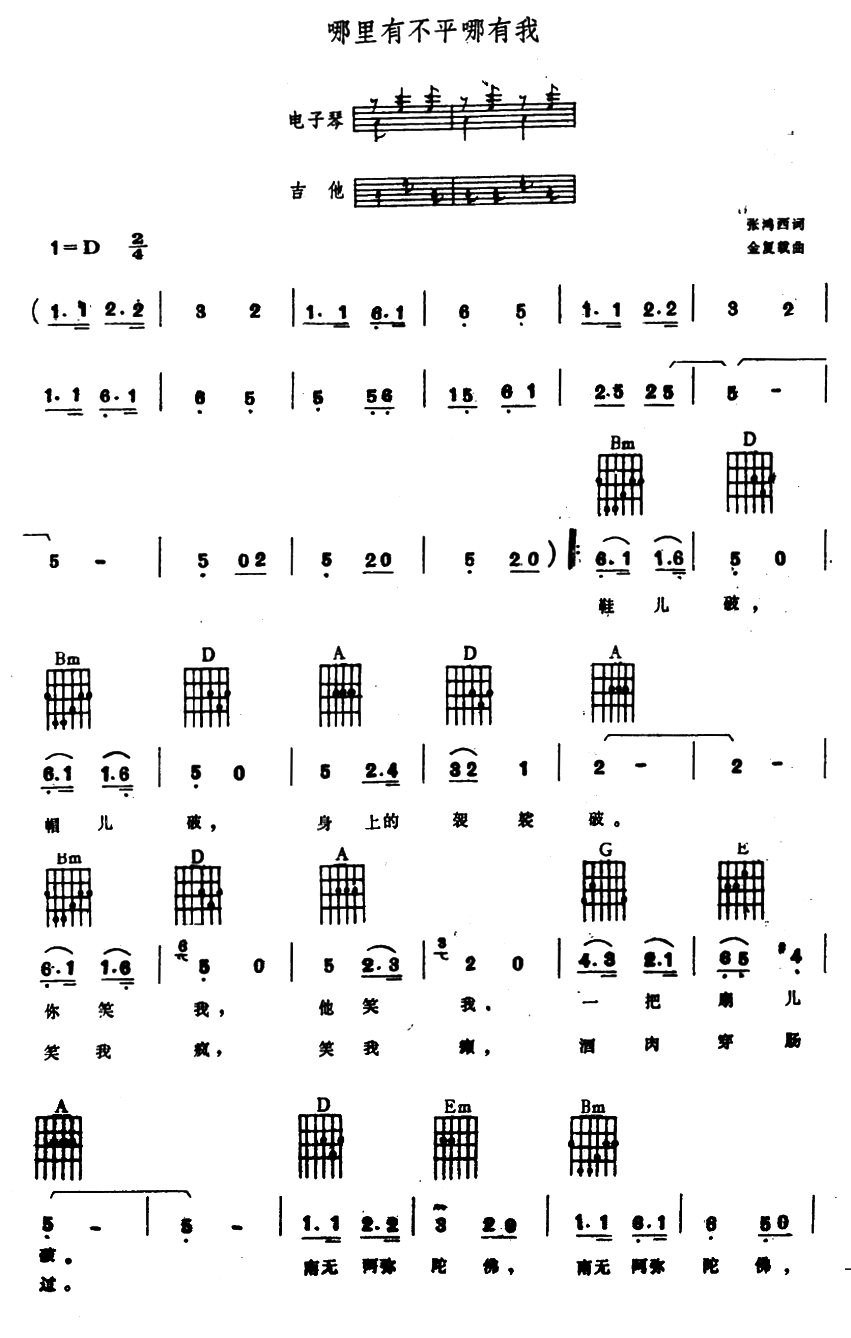 > 哪里有不平哪有我 电子琴吉他弹唱谱