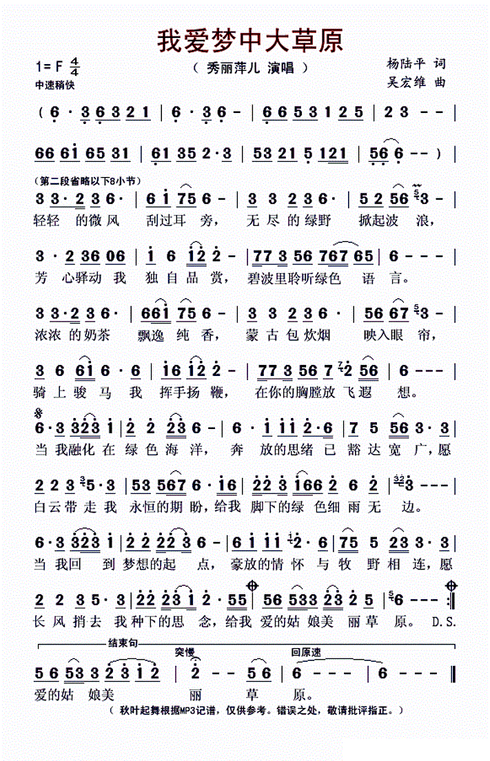 - [歌谱] 我爱梦中大草原