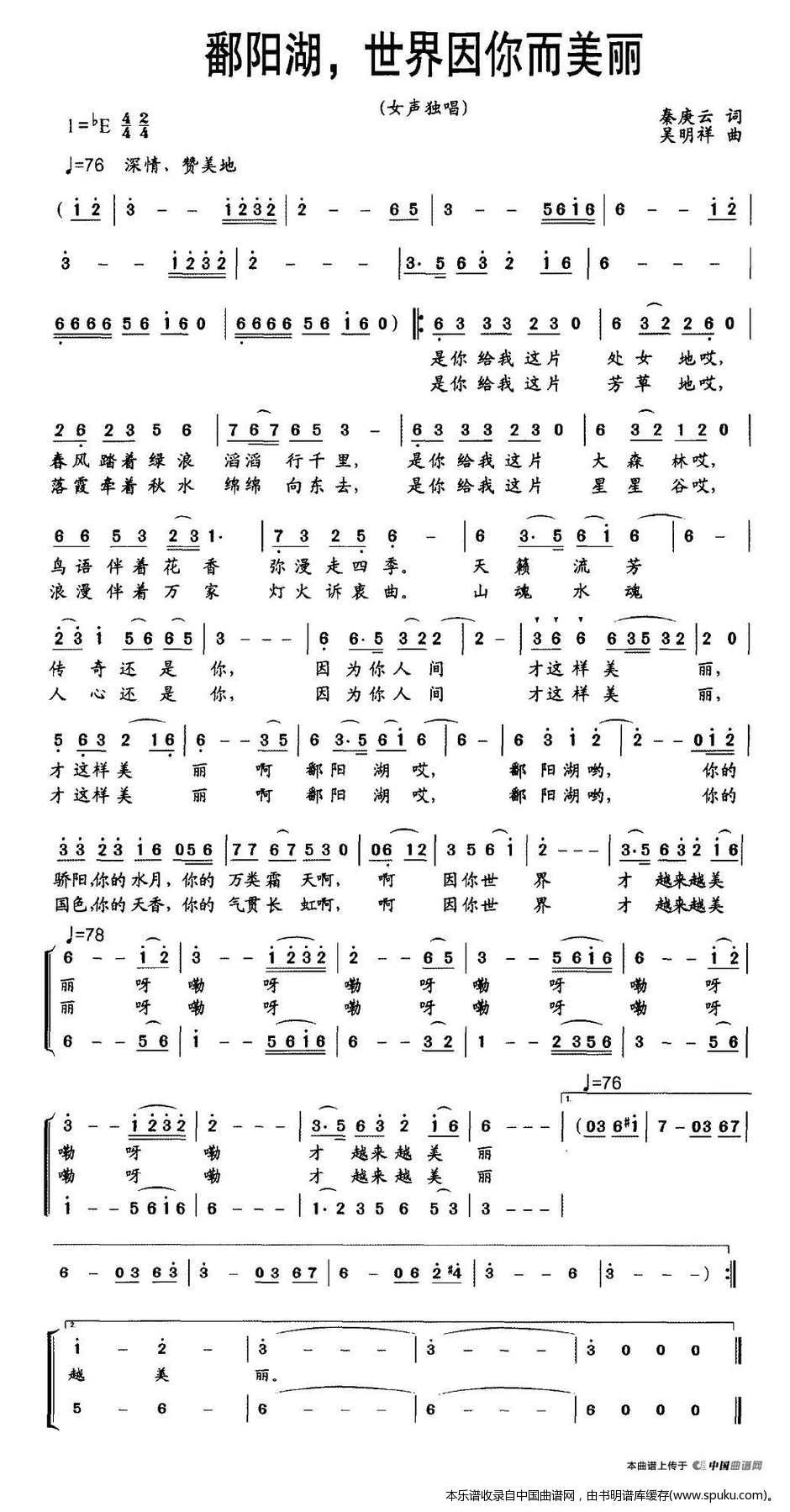 > 鄱阳湖 世界因你而美丽 独唱 合唱谱