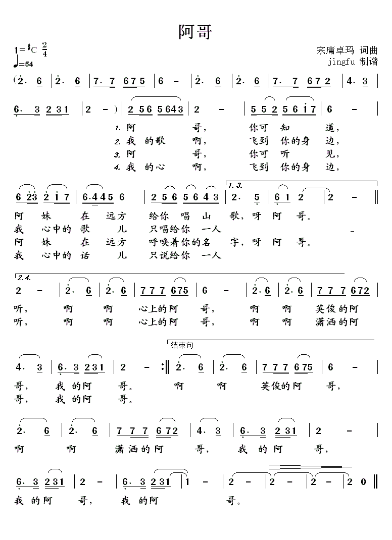 - [歌谱] 阿哥 宗庸卓玛