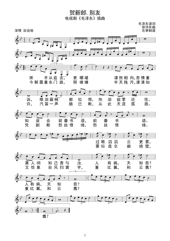 - [歌谱] 贺新郎 别友 电视剧 毛泽东 插曲