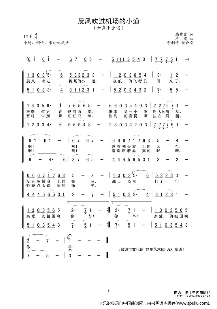 > 晨风吹过机场的小道 女声小合唱 合唱谱