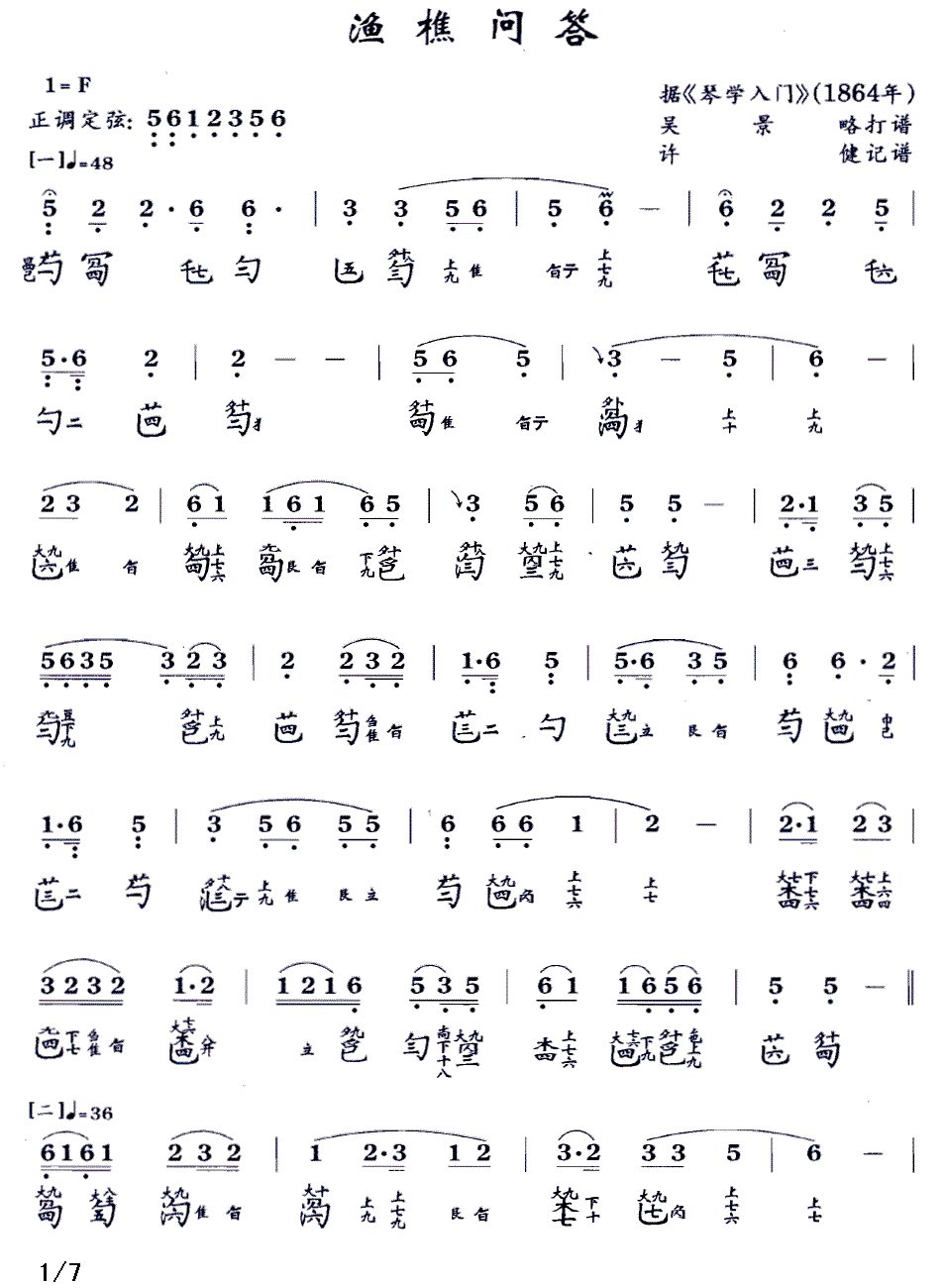> 渔樵问答 古琴谱 F调 减字谱 吴景略打谱