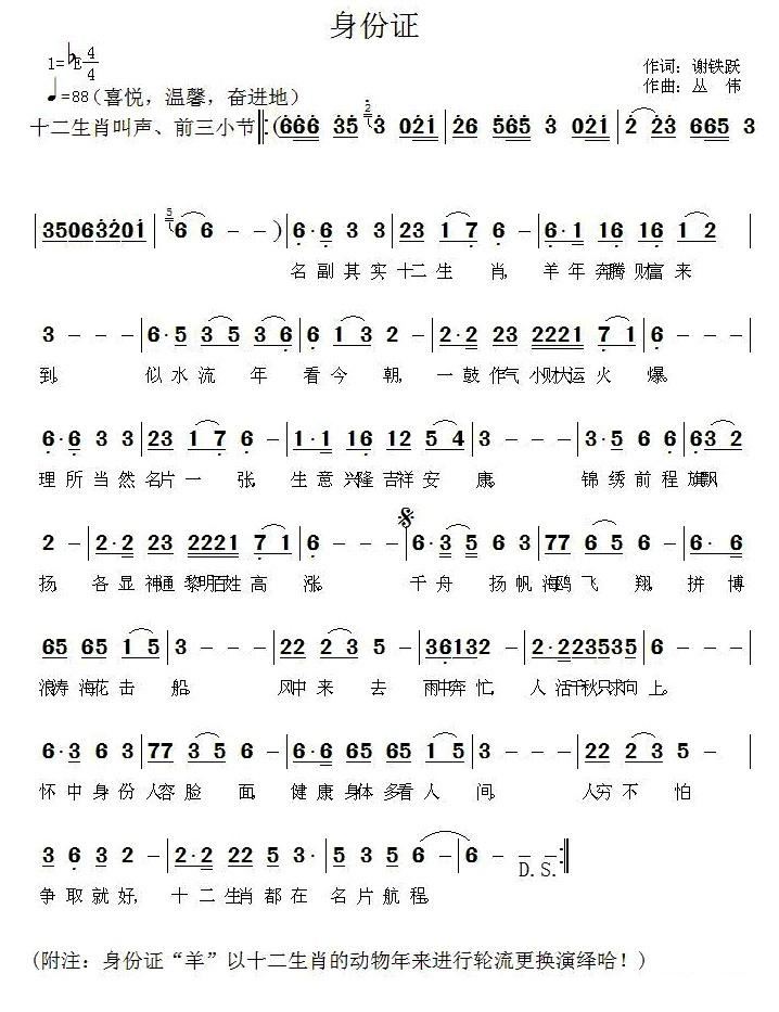 - [歌谱] 身份证 羊年版2015