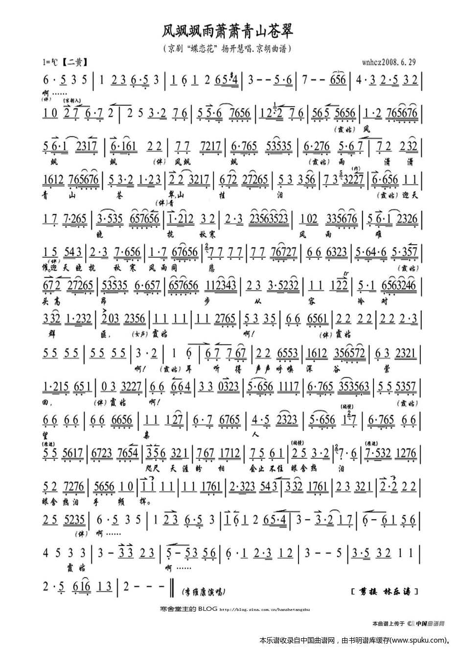 > 风飒飒雨萧萧青山苍翠 蝶恋花 杨开慧唱段 琴谱 京剧戏谱