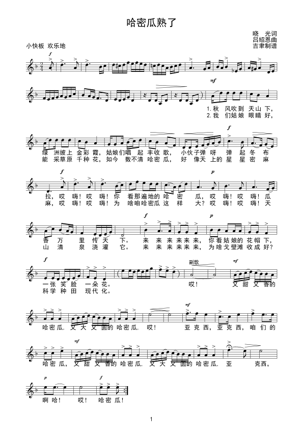 - [歌谱] 诙谐歌 哈密瓜熟了