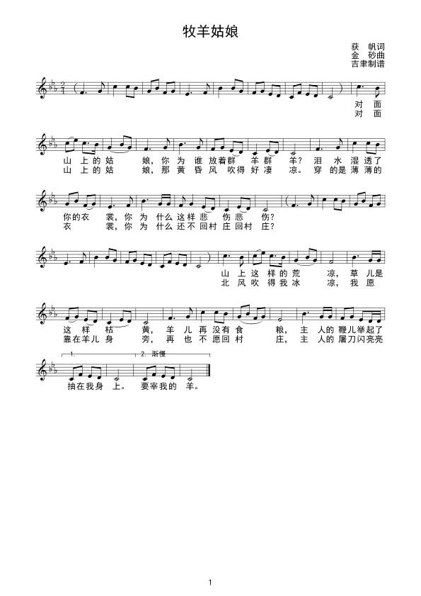- [歌谱] 牧羊姑娘 男声三重唱 合唱谱