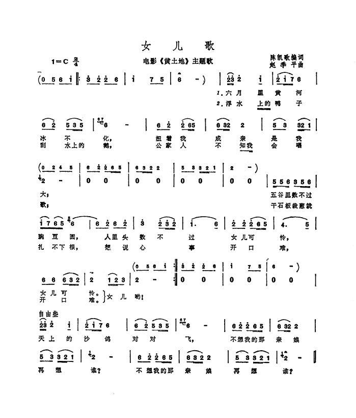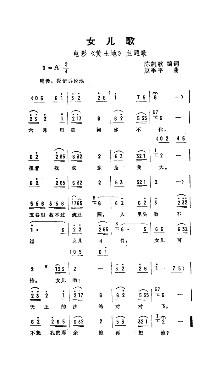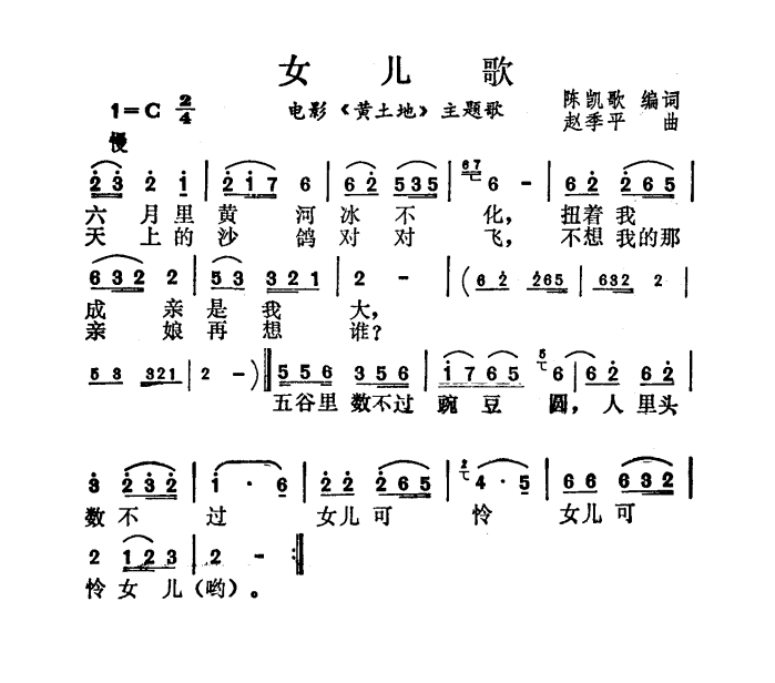 - [歌谱] 黄土地 女儿歌 范琳琳