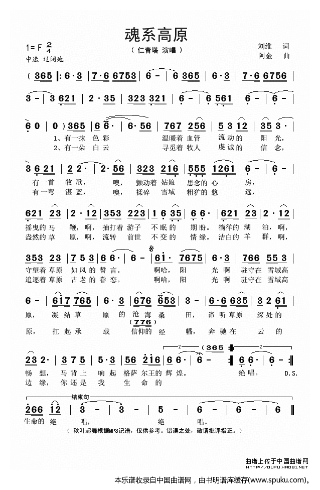- [歌谱] 高原魂