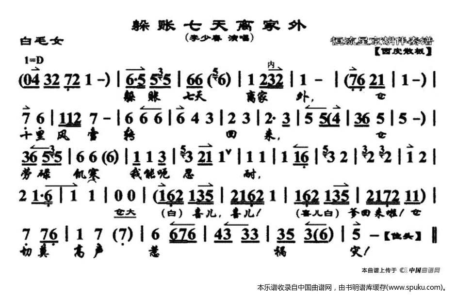 躲账七天离家外 白毛女 杨白劳唱段 唱谱