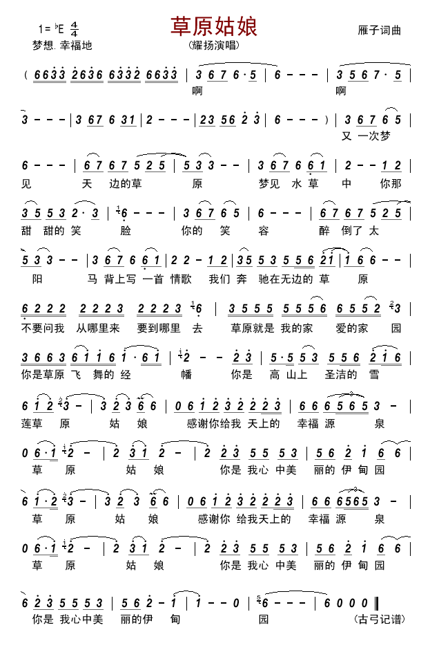 又一次你梦见天边的草原梦见水草中你那甜甜的笑脸你的笑容醉倒了太阳马背上写一首情歌我们奔驰在无边的草原不要问我从哪里来要到哪里去草原就是我的家爱的家园你是草原飞舞的经幡你是高山上圣洁的雪莲草原姑娘感谢你给我天上幸福的源泉草原姑娘你是我心中美丽的伊甸园 http://5sing.kugou.com/yc/2805067.html###