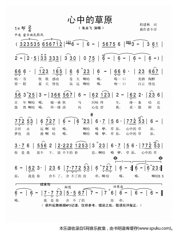 - [歌谱] 心中的草原 朱永飞